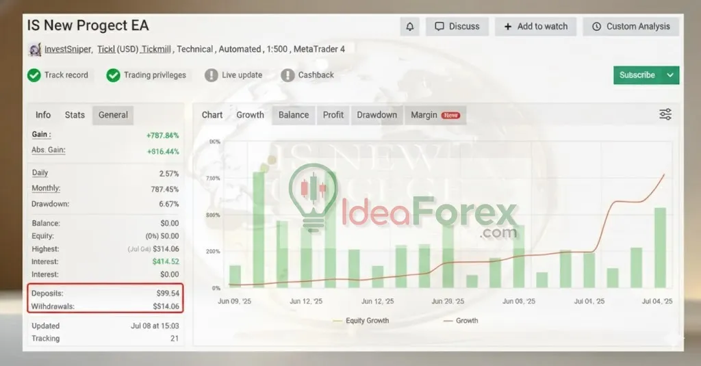 This product is developed by InvestSniper, an author with over 8 years of experience on MyFxBook. He has created many well-known EAs, including IS New Project EA MT5, IS New Project EA, IS VIP One EA, Exclusive Scalping EA, and more. Among these, IS New Project EA MT5 stands out as his top-performing product.
