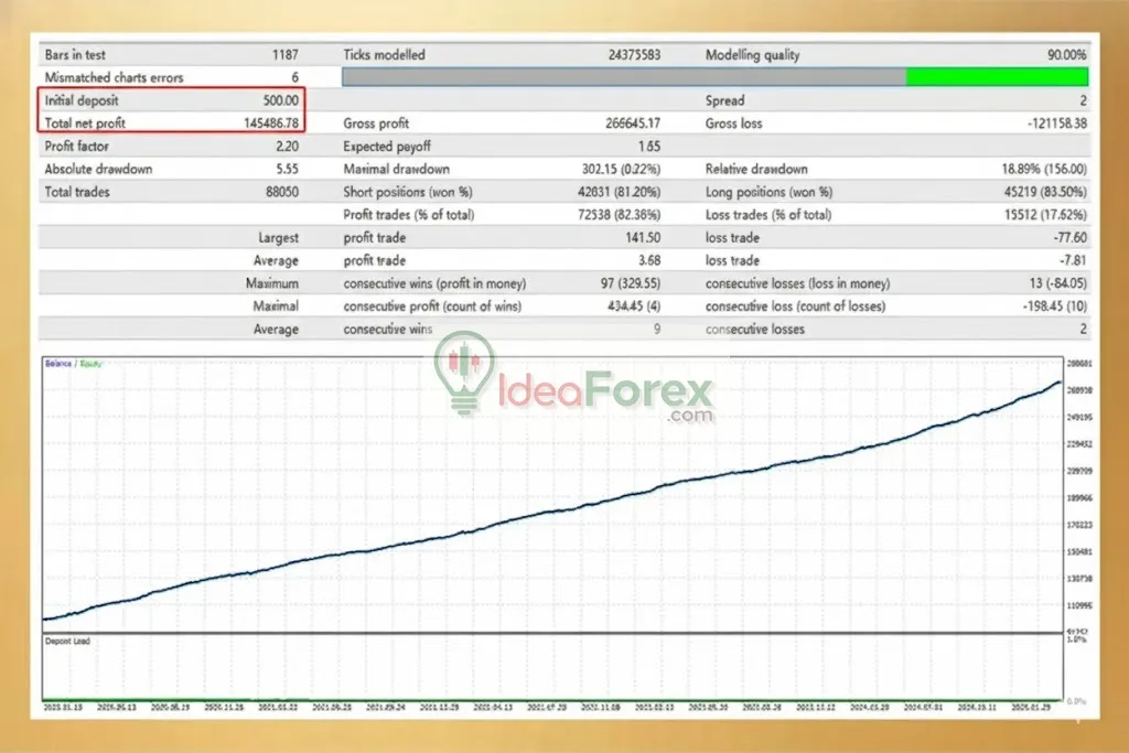 The EA also performs consistently on larger capital, maintaining strong profit growth with minimal drawdown.